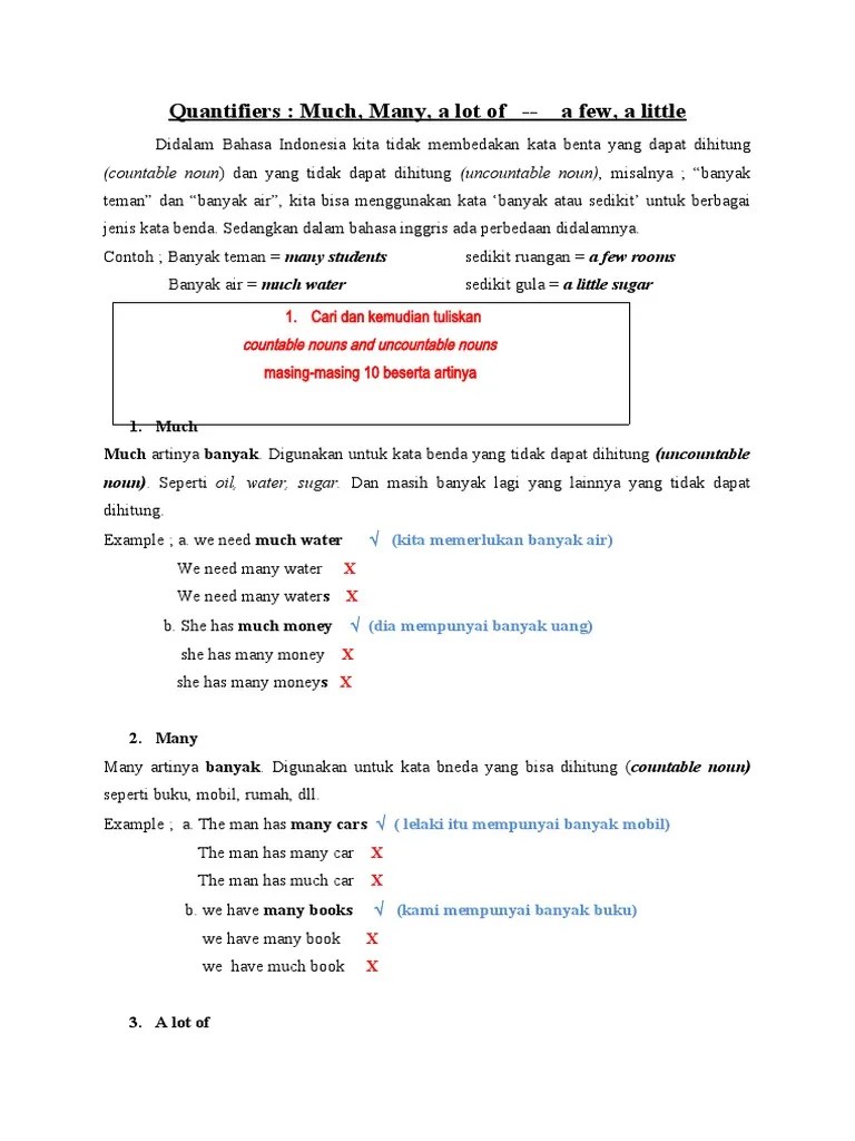Many hanya di tujukan terhadap benda yang dapat di hitung dan sifatnya jamak di gunakan dalam kalimat positive, negative dan interrogative. Hai lc'ers sebelumnya kita sudah membahas nih tentang dua kata yang memiliki perbedaan dalam penulisan tetapi memiliki pengertian yang hampir . Apa sih perbedaan antara "a lot of dan many" apabila kita ingin menyertakan pada kalimat? Some bisa digunakan untuk benda yang . Penggunaan, perbedaan, dan contoh quantifiers (a few, a little, some, any, many, much, and a lot of).